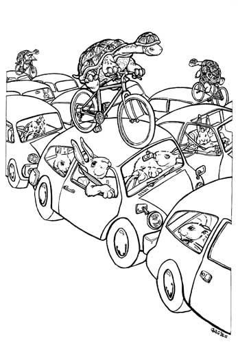 "Leave the Car at Home" For a poster for a pro-cycling campaign. The idea being the hares' cars are like tortoise shells, as the tortoises make better time on their bicycles. Acrylic ink on board, A3. |