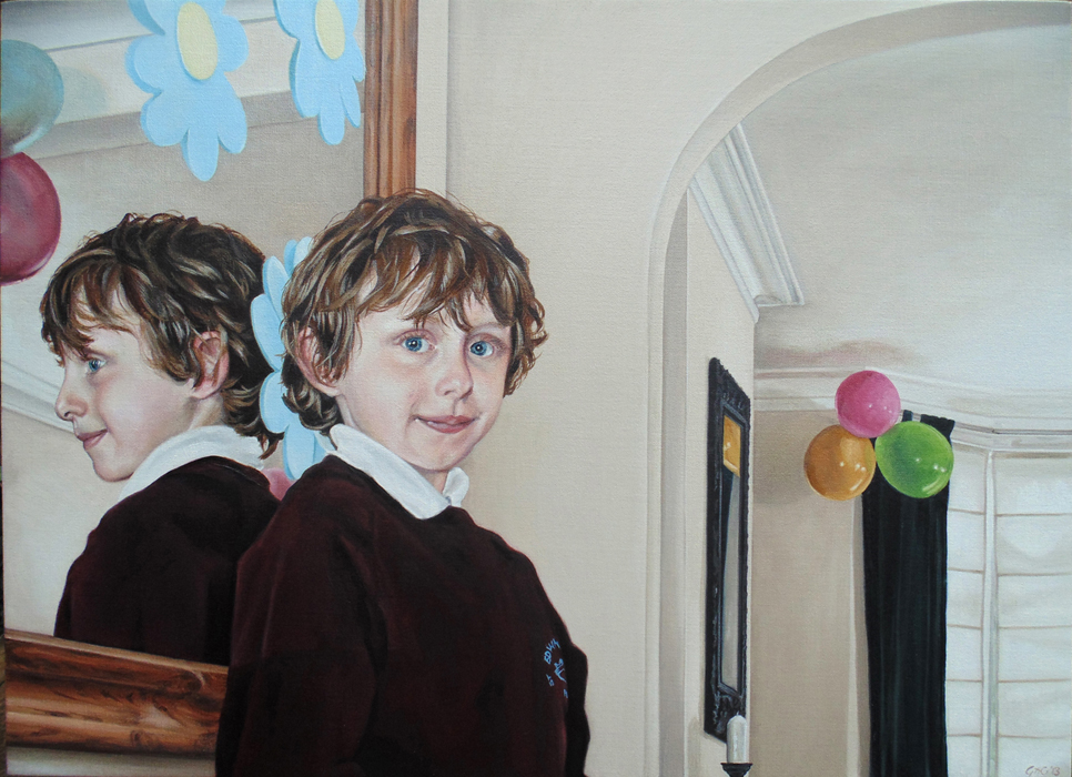 "On the Morning of his Sister's Birthday", a double portrait of my son. Oil on linen, 75 x 55 cms. First sitting May 2013, finished January 2014.