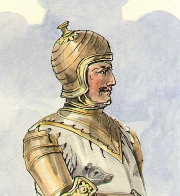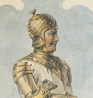 It shows Sir Hugh Morville, one of the knights involved in the martyrdom of St. Thomas a Beckett.